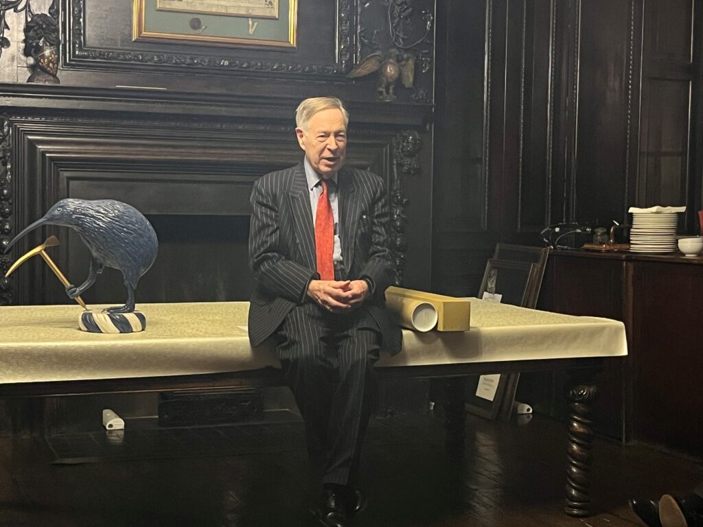In the first room following the court, we explored both the traditions and the scale of the College’s work. The building has occupied the same site since 1555, the same year in which the College’s constitution, still in use today, was written. William estimated that there are well over one hundred thousand coats of arms and variations in existence, a figure that hints at the breadth of heraldic history preserved within the College. We discussed the arms of Sir Edmund Hillary, whose crest features a kiwi to represent his New Zealand nationality, holding an ice pick in reference to his mountaineering achievements. We also learnt some of the technical language of heraldry, including the counterintuitive fact that ‘dexter’ and ‘sinister’ are reversed from their standard Latin meanings, as they are described from the perspective of the person bearing the shield rather than the viewer. While there are no fixed criteria for eligibility for a grant of arms, ‘eminence’ is considered favourably, though in keeping with a constitution nearly five centuries old, no formal definition of eminence exists – so if you think you’re ‘eminent’ give them a call!